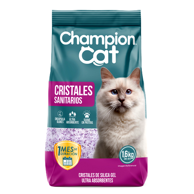 Champion Cat presenta su nueva arena sanitaria de Silica Gel. Los minúsculos canales de los Cristales Sanitarios Champion Cat absorben la orina de tu gato, atrapando y encapsulando automáticamente los olores, para luego evaporar lentamente la humedad. De esta forma, los cristales quedan listos para absorber nuevamente la orina y olores, entregando a tu gato una arena sanitaria limpia y fresca por un tiempo más prolongado.